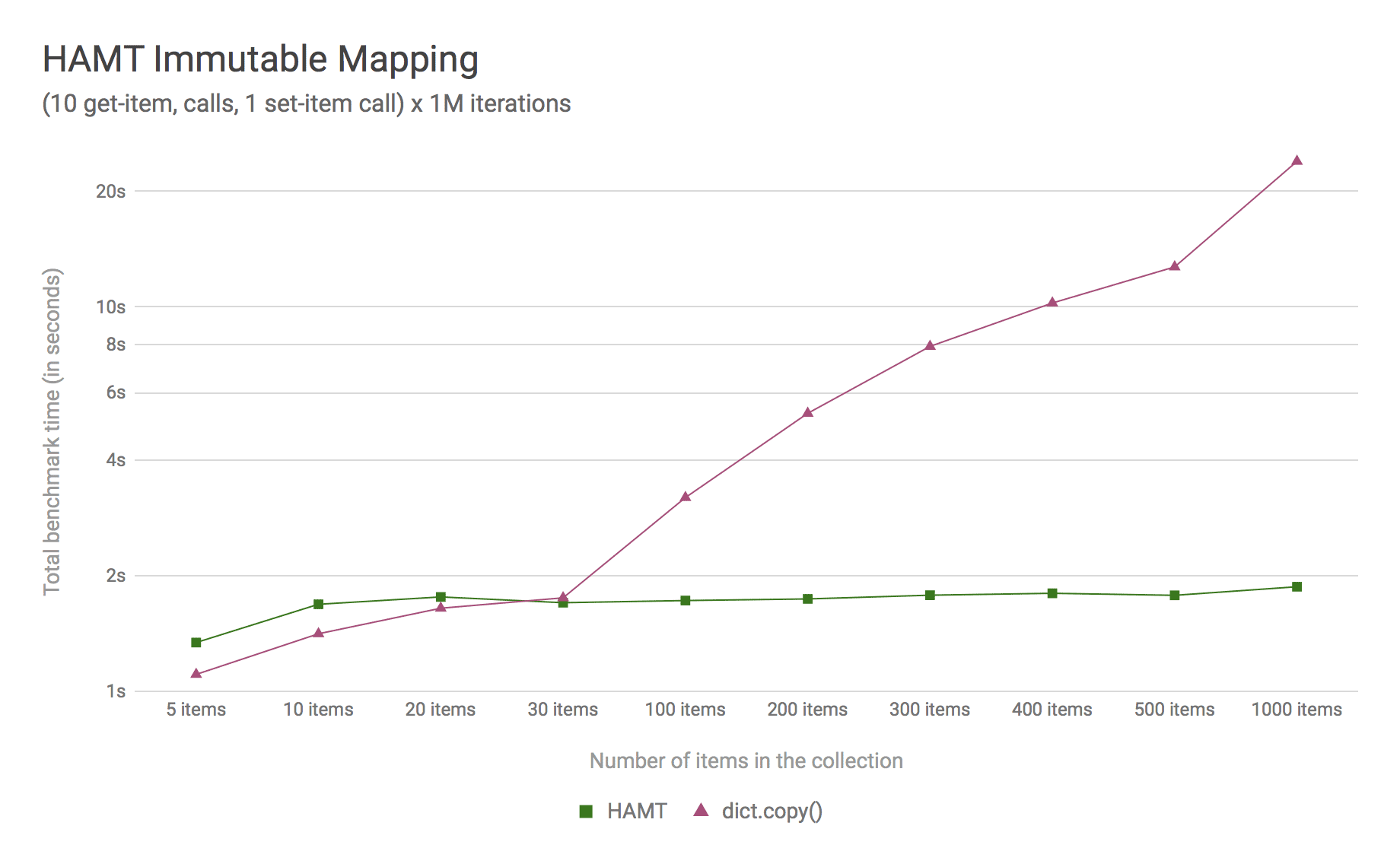 Figure 2 compares the lookup costs of dict versus a HAMT-based immutable mapping. HAMT lookup time is 30-40% slower than Python dict lookups on average, which is a very good result, considering that the latter is very well optimized.